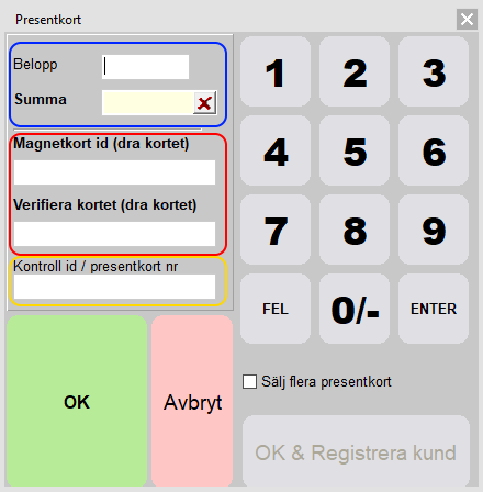 Kontroll id (inringat med gult). Fyll i kortID om det är ett magnetkort. Annars det ID som följs i kassan. Det kan t.ex. vara papperspresentkort som redan är numrerade eller som kassörer håller koll på i en pärm etc.