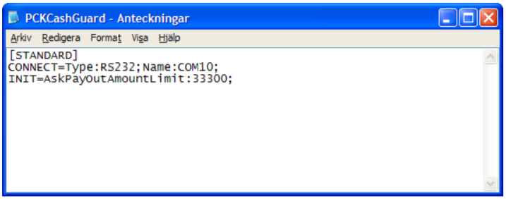 7. Öppna PCKCashGuard.ini i Notepad (Anteckningar), och ställ in den COM port som CashGuard finns ansluten på. Standard i filen står det COM10.