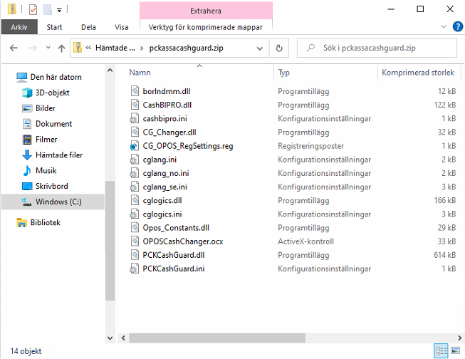 2. Packa upp filen PCKassaChasguard.ZIP och lägg alla filer direkt i PC-Kassa-sökvägen. Standard är sökvägen till PC Kassa: C:\Program Files (x86)\Nutid - PC Kassa\