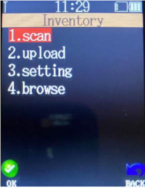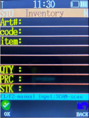 Inventory. Tryck knappen OK eller SCAN för att starta inventeringsfunktionen. Samma program kan även användas för att aktivera etikettutskrift i kassaprogrammet över lagrade artiklar.