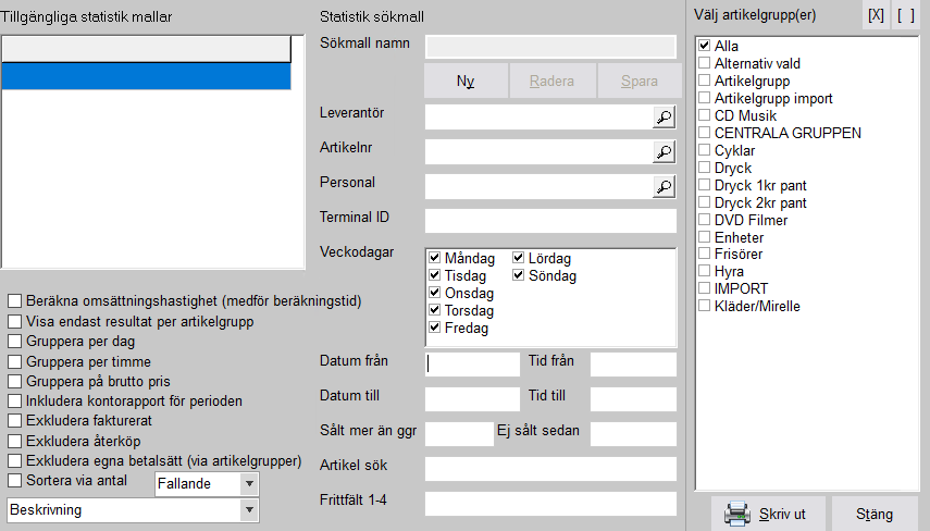Enklaste sättet att få ut försäljningsstatistik är att till höger, under "Välj artikelgrupp(er)", välja alla eller de som man önskar se. Sen fyller man i "Datum från" och "Datum till". Formatet måste vara ÅÅÅÅ-MM-DD (YYYY-MM-DD) och inget annat.