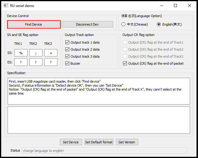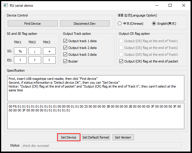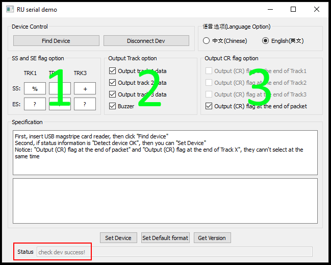 Om läsaren hittas ska statusen längst ner ändras till "check dev success!" och ändringar kan nu göras: