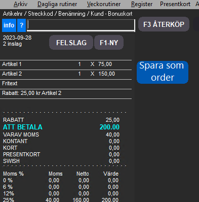 - Spara inslag som en order och skriv ut på kvittoskrivare.