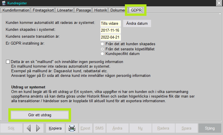 Om en kund begär att få ett utdrag över vilka uppgifter ni har och var i systemet dessa uppgifter använts så har kunden rätt att få detta utan onödigt dröjsmål. Man har alltid en viss tid på sig att ta fram denna information. I kassan finns en knapp som underlättar detta, ”Gör ett utdrag”. Denna knapp exporterar all tänkbar historik som är kopplad till kunden och skapar detta i en fil som kan skrivas ut eller mejlas till kunden.