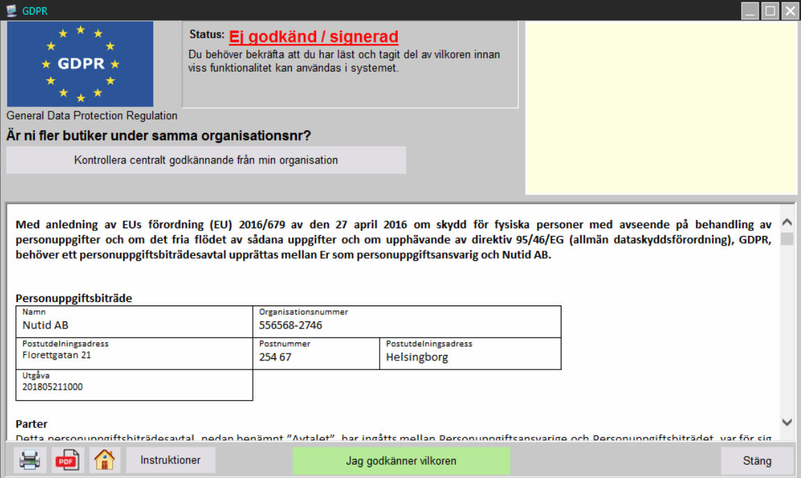 Personuppgiftsbiträdesavtalet är det avtal som reglerar hur Nutid AB kan komma att behandla personuppgifter i den mån vi har tillgång till dem till exempel på våra servrar, via supportärenden, från mejl, sms med mera. Detta avtal öppnas automatiskt i kassaprogrammet tills det har blivit godkänt och detta avtal signeras av ansvarig inom butiken eller kedjan som använder kassaprogrammet.