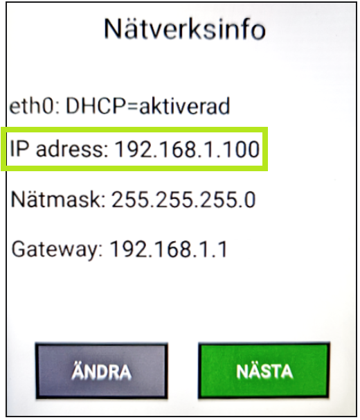 - Bläddra via "Nästa"-knappen till sidan "Nätverksinfo" där IP-adressen framgår i statusfönstret.