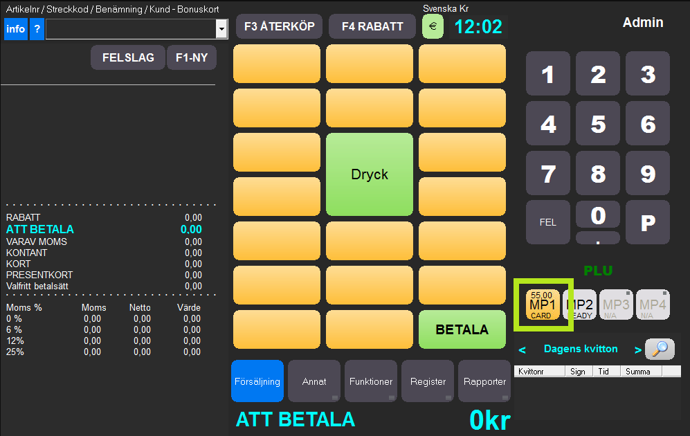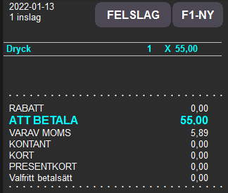 I exemplet nedan är en helt vanligt kvittoinslag på 55kr gjort. Så fort man trycker på snabbknappen för MP1 (Mutlipay-terminal 1) kommer beloppet lägga sig redo i bakgrunden samt i kortterminalen och invänta att kunden blippar eller sätter i sitt kort.