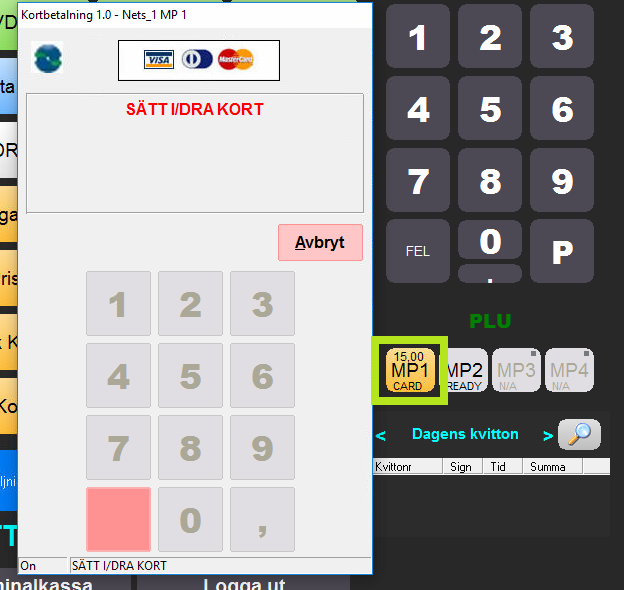 "MP"-knappen indikerar att kortterminal ett (MP1) inväntar kundens kort med gul färg, texten "CARD" samt det belopp som är skickat till terminalen.