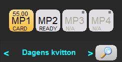 När betalningen är gjord kommer kvittot automatiskt skrivas ut och MP-knappen återgå till READY-läge igen. I exemplet nedanför är betalningen i MP1 klar.