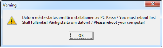 Felmeddelande - Datorn måste startas om för installationen av PC Kassa