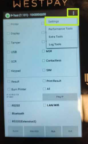 Tryck på knappen "P-Test" vartefter en Westpays testmjukvara öppnas. För säkerhets skull gör inget i denna app mer än att gå vidare för Androidinställningarna.