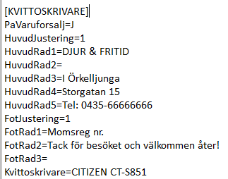 Denna följer med chaplin.ini. Ibland fungerar det dock inte att återanvända chaplin-filen (olika typer av datorer) men det står i klartext om man öppnar filen med Anteckningar (Notepad) eller liknande. Sök efter Kvittoskrivare. Huvudrad 1 till 5 samt Fotrad 1 till 3 (dock kan det finnas upp till 5 fotrader).