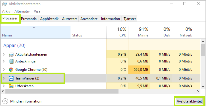 Om datorn fortsätter noterar på att TeamViewer är igång behöver troligen själva processerna för TeamViewer avslutas manuellt via datorns Aktivitetshanterare. Vid osäkerhet tag kontakt med datorkunnig för hjälp med detta då felaktiga stängningar av processer kan påverka operativsystemet negativt.