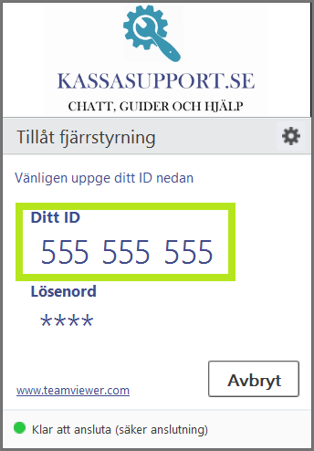 Lämna "Ditt ID" som framgår i fönstret till supportteknikern för möjlighet att fjärrstyra kassan.