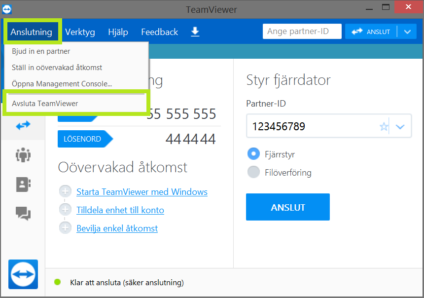 Välj därefter menyn [Anslutning] följt av [Avsluta TeamViewer]. Står det på engelska välj [Connection] och därefter [Exit TeamViewer] samt svara Ja/OK på eventuella frågor om att avsluta TeamViewer.
