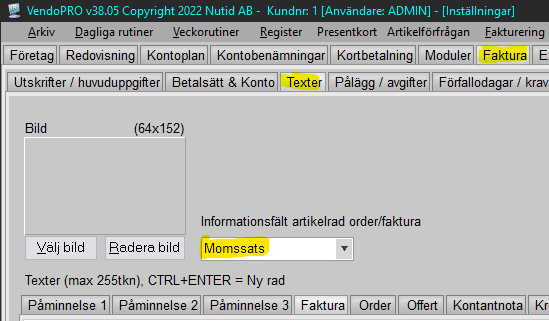 - Välj där fliken Faktura samt underfliken Texter