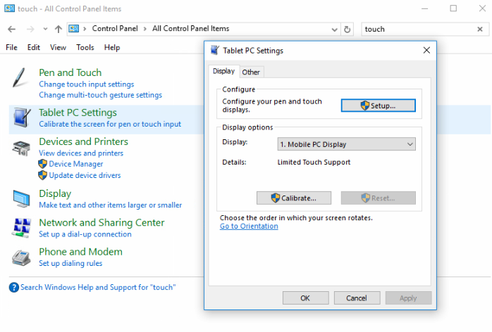 Öppna kontrollpanelen och gå vidare till "Tablet PC Settings"