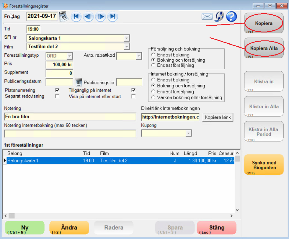 a) Markera den föreställningen som ska kopieras och tryck sedan på knappen kopiera (alternativt F8 tangenten)
