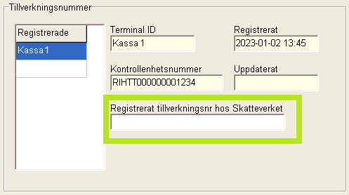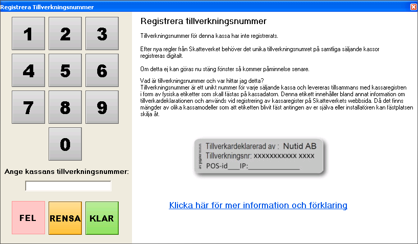 Om tillverkningsnumret inte anges kommer ett påminnande fönster automatiskt öppnas i samband vid omstart alternativt dagsavslut när sju dagar har passerat fram tills att tillverkningsnumret är angivet. Detta fönster kommer återkomma på samtliga säljande kassaterminaler (ej backoffice) fram tills numret är angivet i rutan.