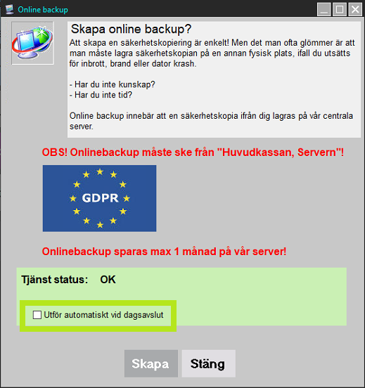 Markera kryssrutan ”Utför automatiskt vid dagsavslut” för att systemet automatiskt ska upprätta en onlinebackup vid dagsavslut.