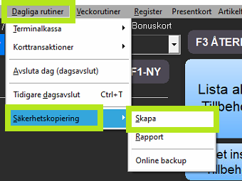 Det finns flera sätt att skapa en säkerhetskopia (backup) via det PC-baserade kassasystemet. Det viktigaste är att det skapas regelbundet och att denna sedan lagras på en mycket säker extern plats ifall något oväntat större systemfel skulle inträffa.
