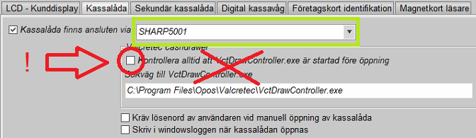 Valcretec cashdrawer Kontrollera alltid... måste vara avmarkerad.