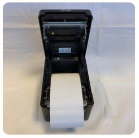 Öppna locket och kontrollera så att det finns en pappersrulle som är rätt isatt. Kontrollera även att det inte finns några gamla plaströr från tidigare kvittorullar. Stäng locket igen.