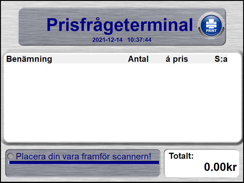 Prisfrågeterminal är en tilläggsmjukvara och komplettering till det PC-baserade kassasystemet för att hantera prisförfrågningar genom att en kund på egen hand skannar in streckkod och får reda på priset.