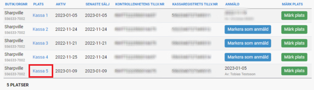 I exemplet används kassaplats 5 och därför trycker vi på den blå texten "Kassa 5".