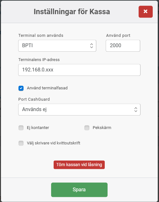 Ange sedan "Terminalens IP-adress". Låt "Använd port" vara kvar på 2000. Se i separat artikel hur man kontrollerar kortterminalens IP-adress.