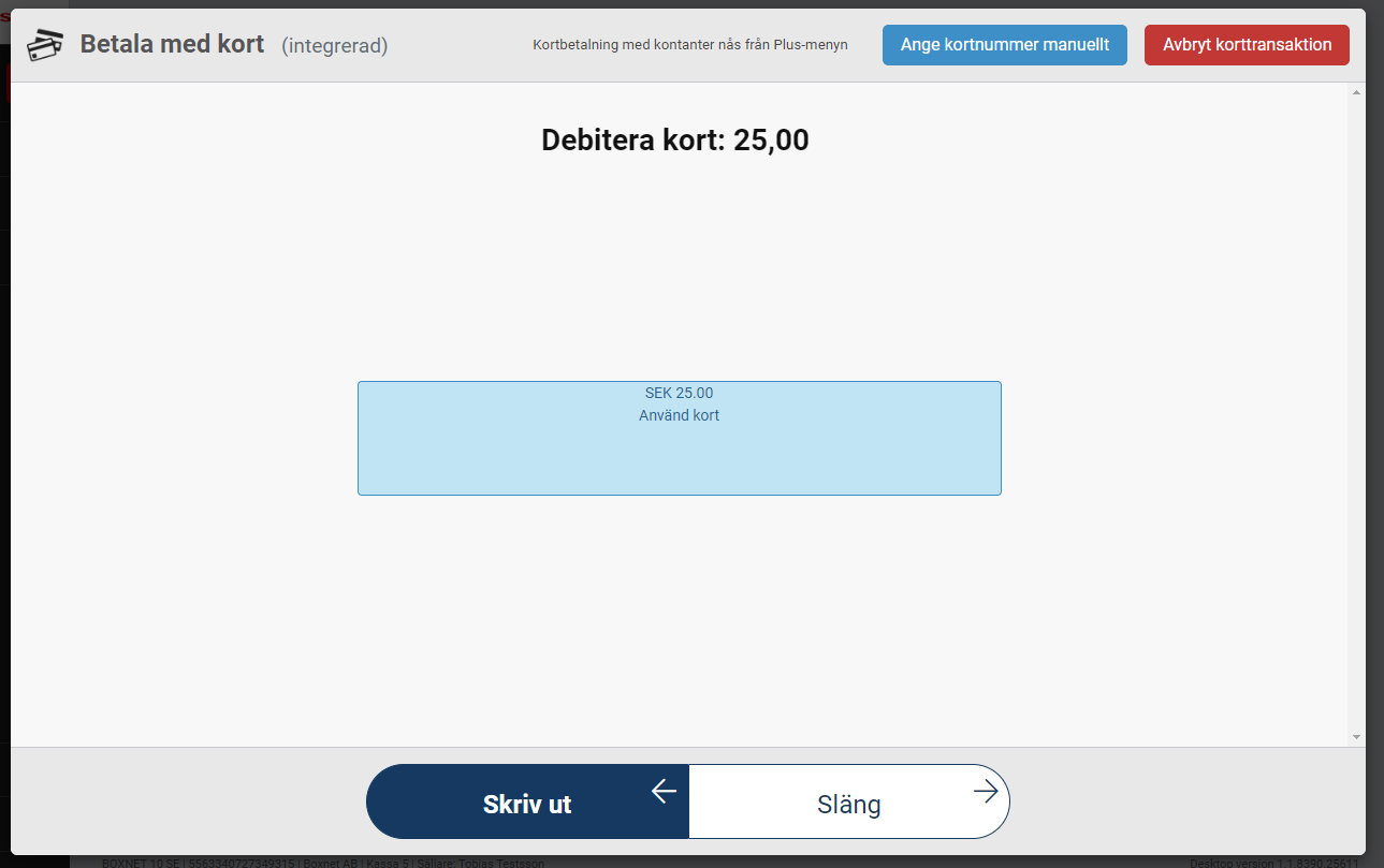 Vid betalning växlas informationen till ett helskärmsfönster som inväntar svar från kortterminalen.