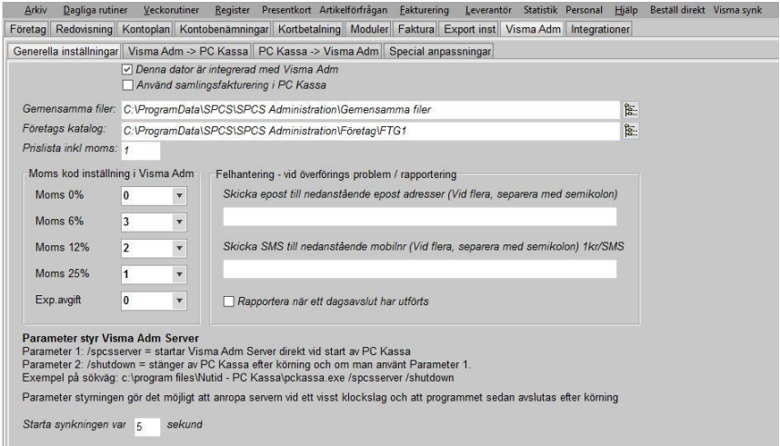 Detta beror oftast på att man uppdaterat Visma till en SQL version och då måste man ställa in sökvägarna till Vismabolagets filmappar. detta gör man under Arkiv - Visma Adm och där finner man två sökvägen, en till de gemensamma filerna och en till företaget. Dessa sökvägar finner man i Visma administration om man går in på Hjälp - Om Visma administration - Systeminfo Detta fungerar ej alltid och i vissa fall måste man kopiera dessa filer till PC-kassa mappen: adk.dll,spcsadm.xml och xerces-c2_7.dll dessa kan man hitta i sökvägen till programfiler som finns på samma plats som man finner sökvägen till bolaget och de gemensamma filerna. Man bör också uppdatera PC-kassa om det är så att ingen av dessa lösningar/felbeskrivningar passa in på det problemet som kunden har, i senare versioner så är synken mer utvecklad och förklara mer utförligt vad som är fel samt att det kan vara versionsfel. Det är alltid ofarligt att uppdatera PC-Kassa oavsett vilken version man använder.
