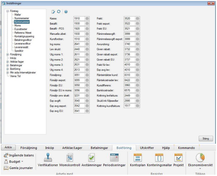Konton som finns i PC-kassa och således på försäljningen saknas i Visma administration, dessa måste då läggas in där. Detta gör man under Bokföring - Kontoplan och i Arkiv – Inställningar – Företagsinställningar - Kontonummer.