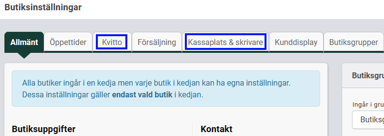 Vi ska kika på flikarna "Kvitto" samt "Kassaplats & skrivare".