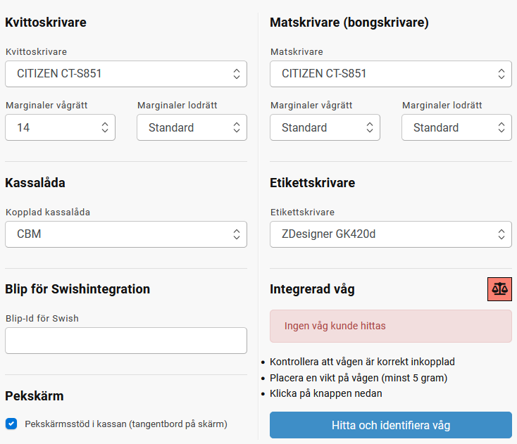 Här finns inställningar för kvittoskrivare, bongskrivare, etikettskrivare och kassalåda samt digital våg.
