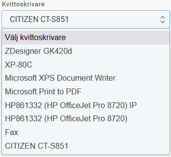 Alla installerade skrivare visas här och man behöver veta vad kvittoskrivaren heter så att man väljer rätt. Jämför med produktmärkningen på din skrivare.