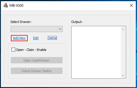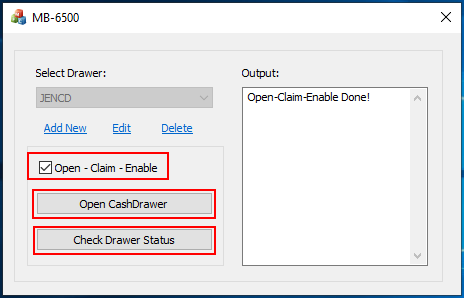 Open-Claim-Enable kan nu bockas i och kassalådans funktion kan testas med knapparna Open CashDrawer och Check Drawer Status
