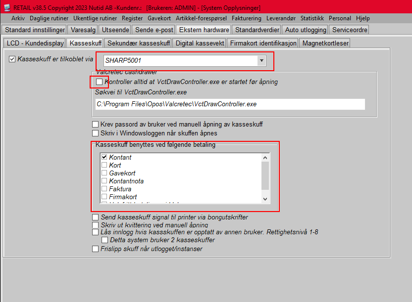 I Systemuppgifter/Extern hårdvara/Kassalåda använd SHARP5001 och bocka ur "Kontrollera alltid att VctDrawController.exe är startad före öppning"