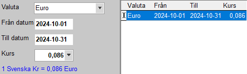 Här ställer man Från datum och Till datum. Man kan inte låta dessa fält vara tomma, då aktiveras inte valutan i kassan. När fråndatum passerats så avaktiveras valutan i kassan.