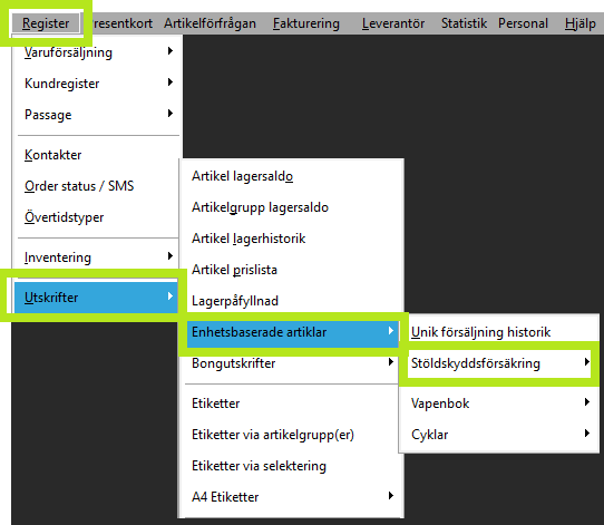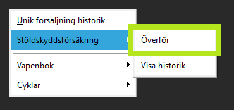 Öppna menyn "Register - Utskrifter - Enhetsbaserade artiklar - Stöldskyddsförsäkring - Överför".