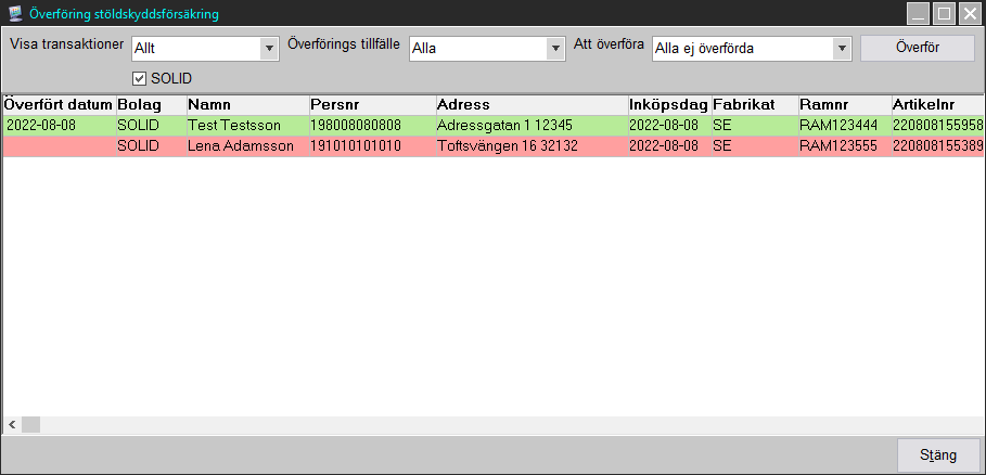 I fönstret som öppnas framgår de försäkringar som är överförda med en grön färg och de som inte blivit överförda i rött. Det går bra att filtrera och visa urval via rullistorna i den övre delen av fönstret.