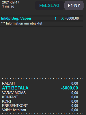För att kunna betala ut pengar till en kund mot ett inköp av en vara behövs ett betalsätt för detta. Namnge betalsättet "Inköp Beg. Vapen" eller liknande för enkel uppföljning. Detta betalsätt registreras på samma plats som vanliga artikelgrupper men skillnaden är att detta markeras som ett betalsätt. Ett betalsätt är omsättningsbefriat och påverkar alltså inte försäljning i kassan. Lagerförändringen sker när vapnet senare levereras in.