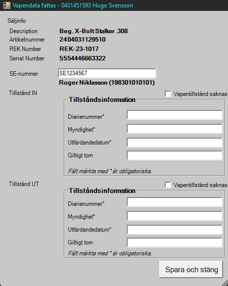 Ta betalt för vapnet samt ange tillståndsinformation. Finns inte detta så kompletteras uppgifterna i efterhand genom att välja Vapentillstånd saknas.
