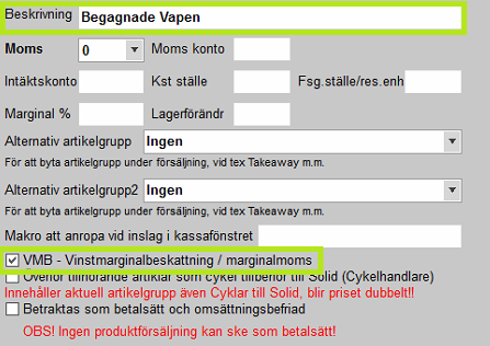 Viktigt är att artikelgruppen markeras med rutan VMB - Vinstmarginalbeskattning / marginalmoms för att kassan ska använda momsberäkningen därefter.