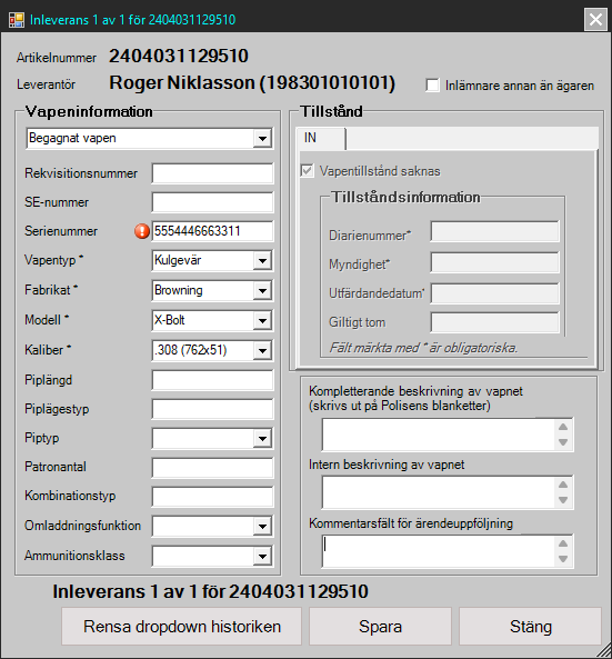 Registrera vapnet i artikelgruppen för Begagnade Vapen, välj inlämnaren som Leverantör samt sätt Enhet till Vapen. Ange Beskrivning och övrig information. Spara informationen med knappen [Spara].