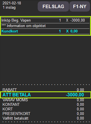 Tryck på knappen för att registrera inköp och utbetalningsbelopp till kund.