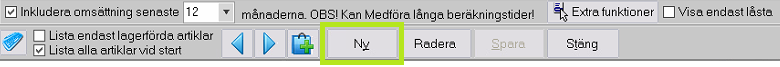 Öppna Artikelregistret antigen genom att trycka in CTRL+A eller gå via menyn Register - Varuförsäljning - Artiklar. Tryck på knappen [Ny] längre ner i mittersta delen.