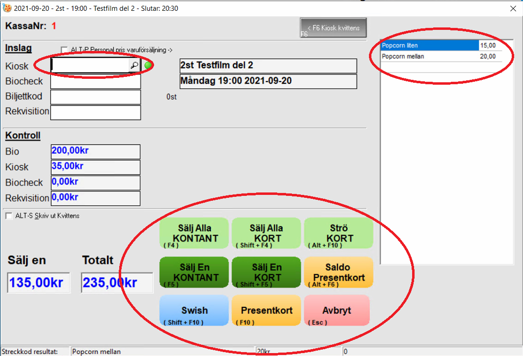 2. Efter att man har valt placeringen (om platsnumrering) Så kommer man vidare till försäljningsläget.