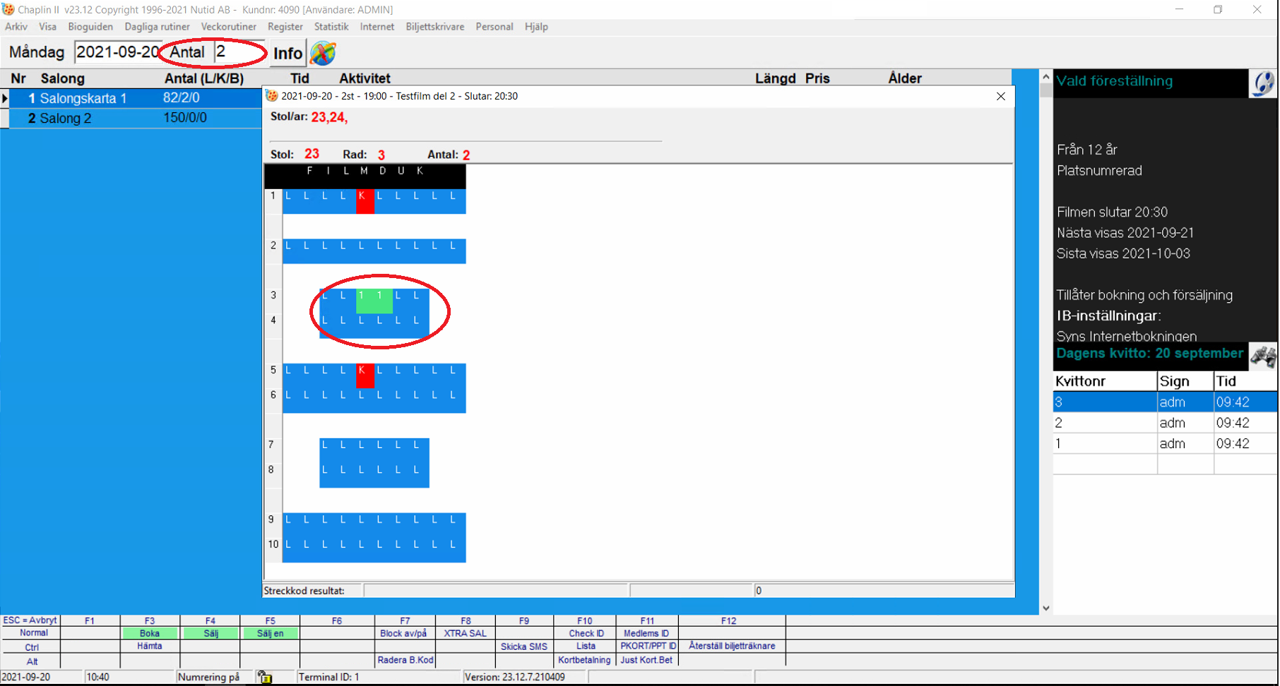 2. Vid numrerade platser så trycker man på F3 tangenten när man har valt önskade platser i salongskartan.