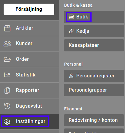 Man kommer åt butiksinställningar via Inställningar - Butik